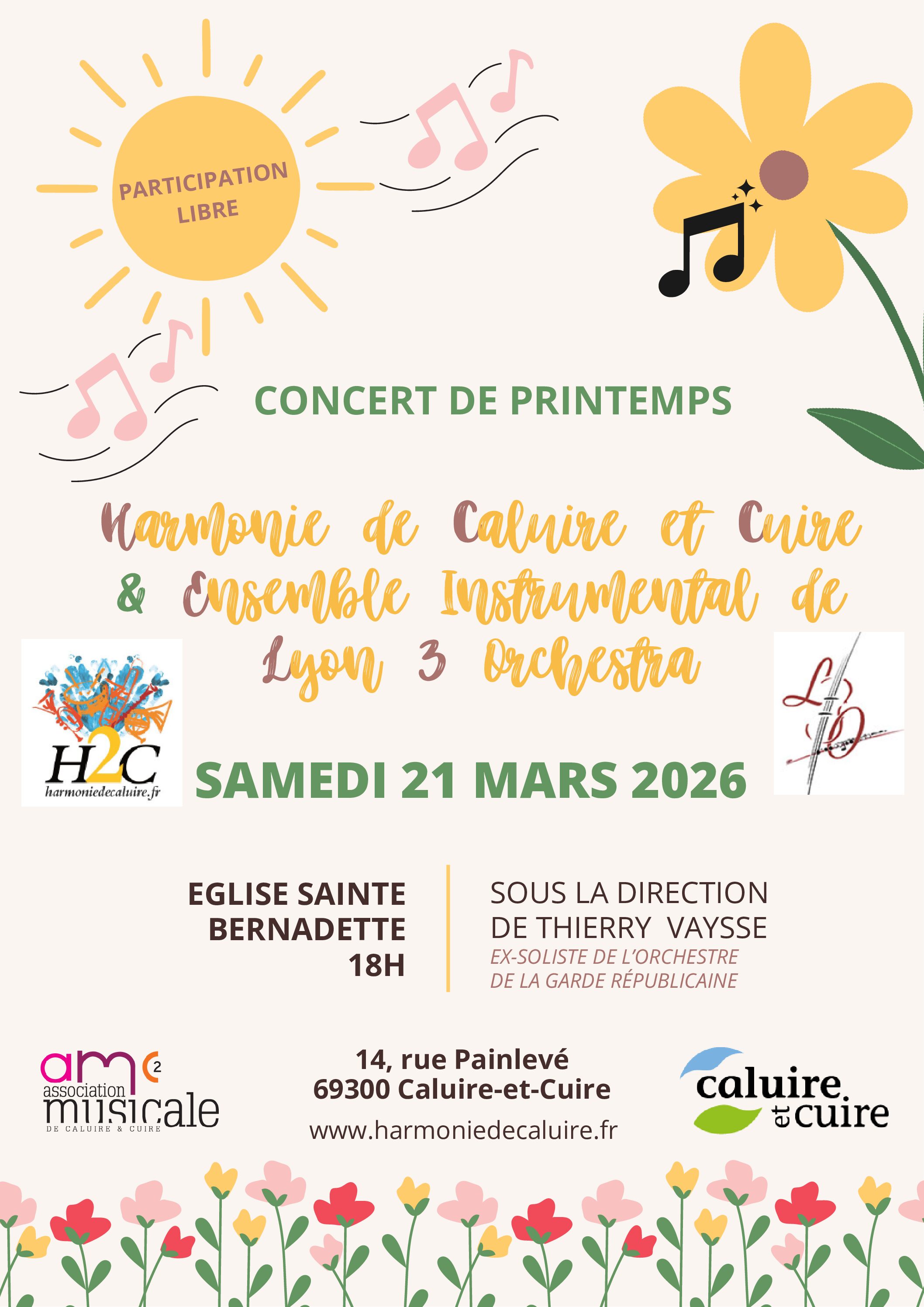 L’Harmonie de Caluire-et-Cuire et l’Ensemble Instrumental de Lyon 3 Orchestra vous invitent à leur concert de printemps le samedi 21 mars 2026 à 18h à l’église Sainte-Bernadette, à Caluire-et-Cuire. Ce concert réunira les... Pour en savoir plus
